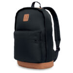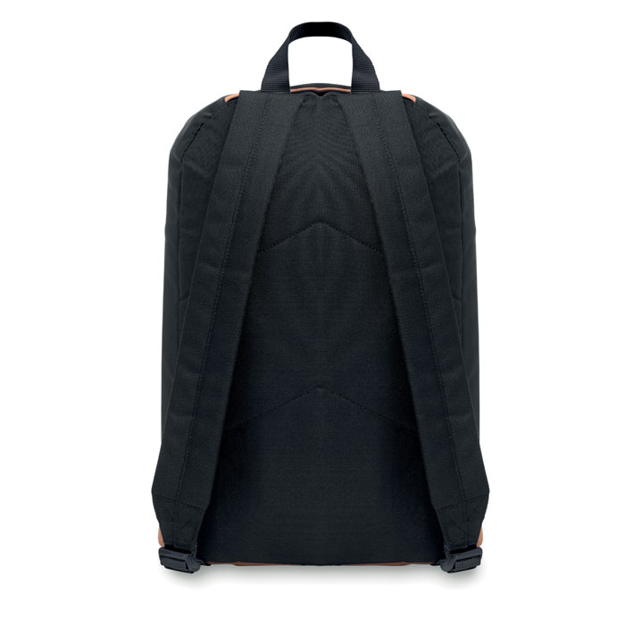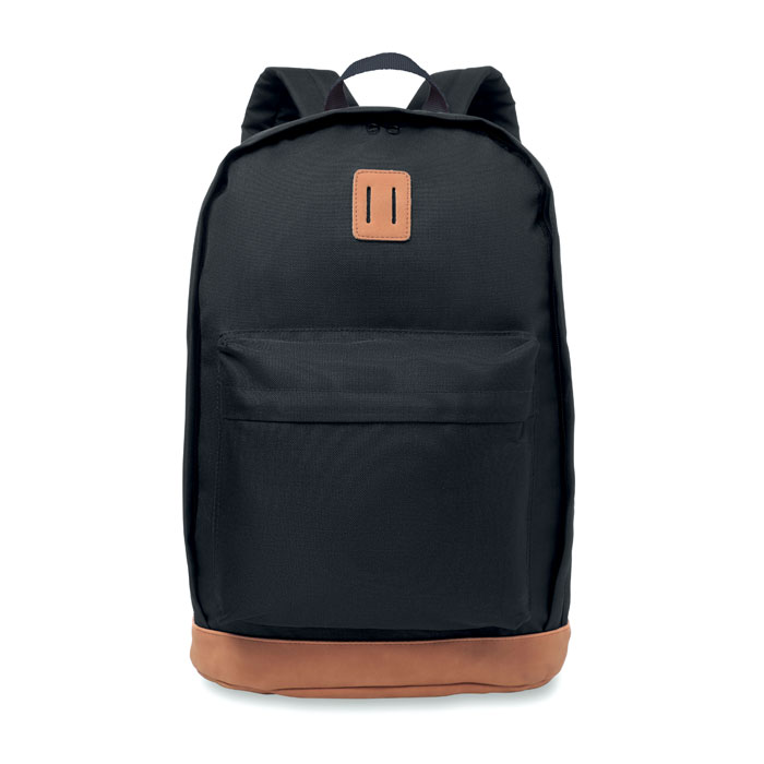 Backpack in 1000D polyester with outside pocket with zipper and PU leather details. Zippered pocket on top